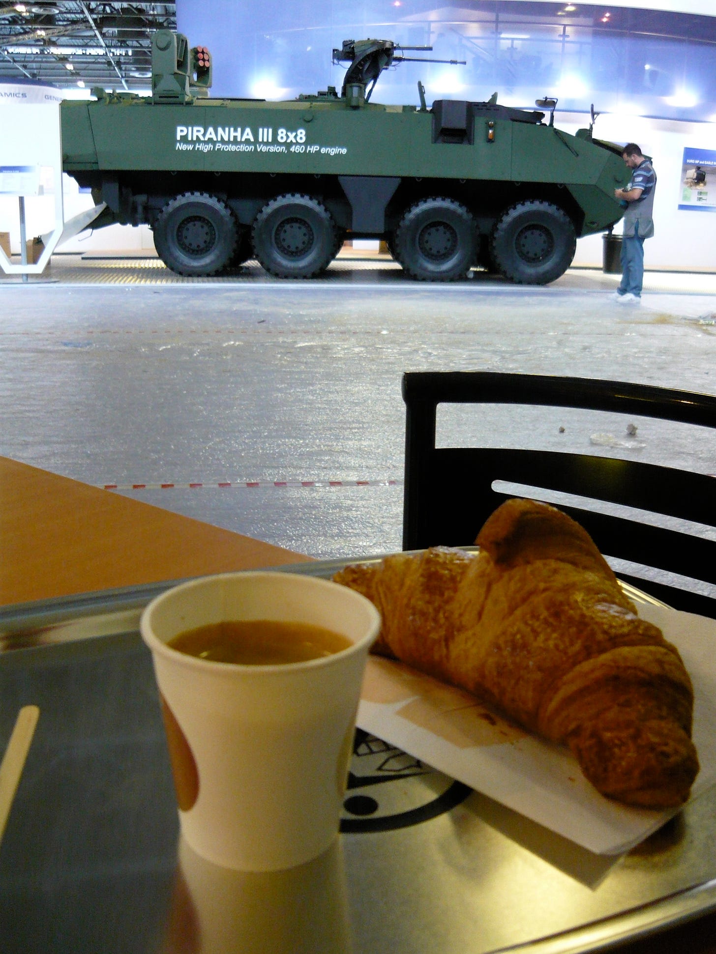 My 2 shows in Paris were more relaxed and had zero insanity. The Raytheon booth was a standalone construction. No bomb sniffing dogs and all of the coffee I could drink during my shift. My first coffee pod machine experience.