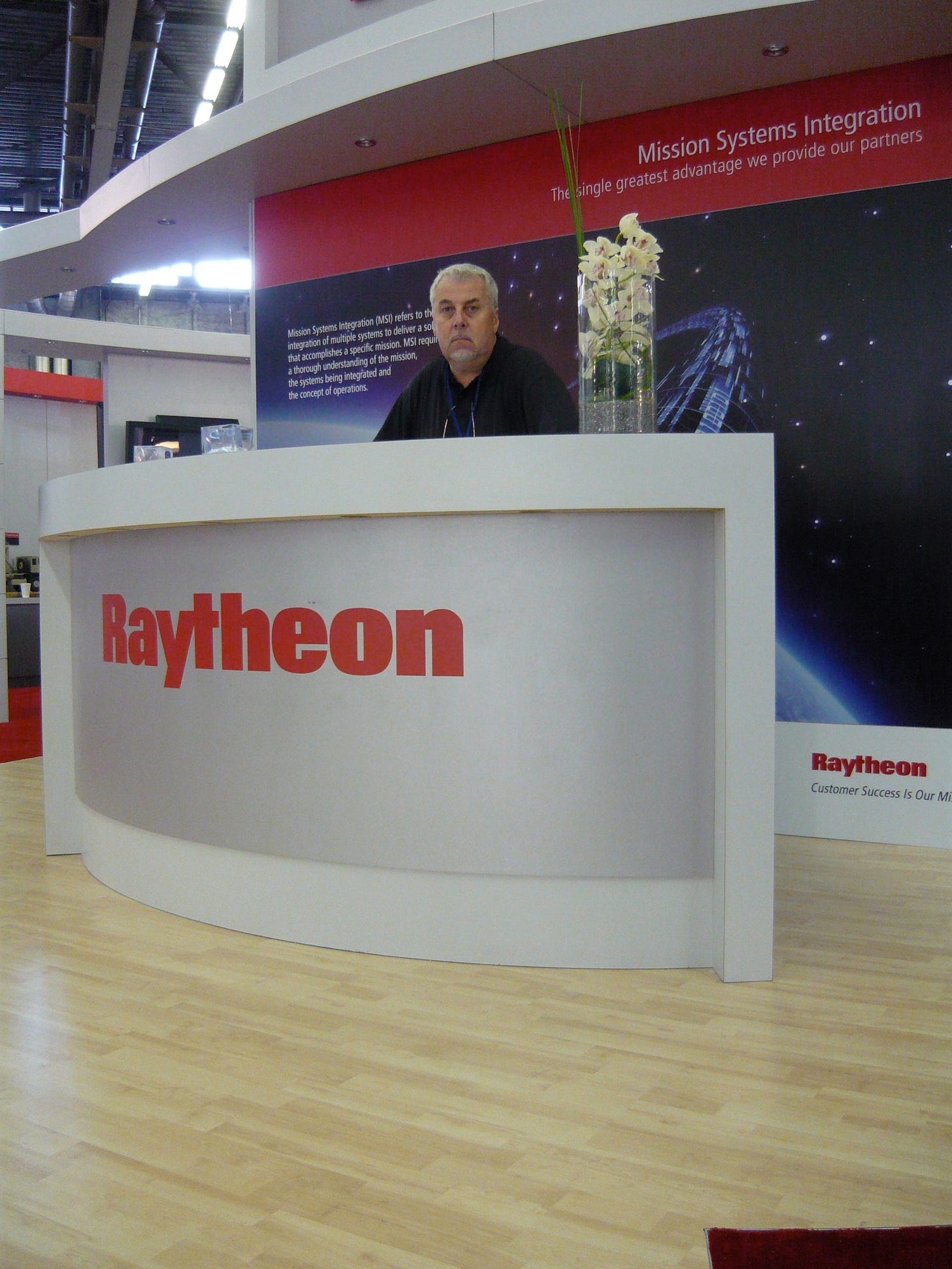 I was processed, hired and paid by the UK Security Company that had the contract to provide security for Raytheon. They had been employed in these show events for years. The Department of Defense and Raytheon protocol required for an “American Eyes Only” be on site 24/4 in the booth. That was my gig.